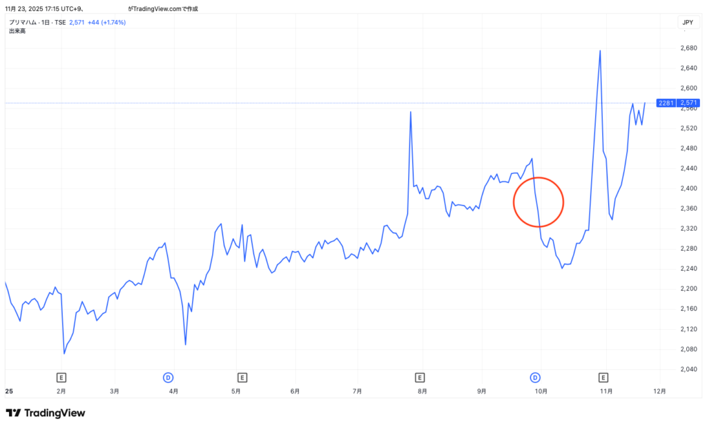 …と思っていましたが、優待ねらいの買いが多いのか、9月の優待権利落ち後の下落が大きいですね(下図赤丸あたり)